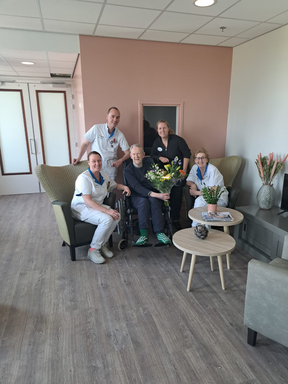 Op maandag 1 mei mochten we gelijk de eerste revalidant op deze nieuwe afdeling ontvangen. We verwelkomden hem met een fleurig bloemetje voor op zijn kamer.