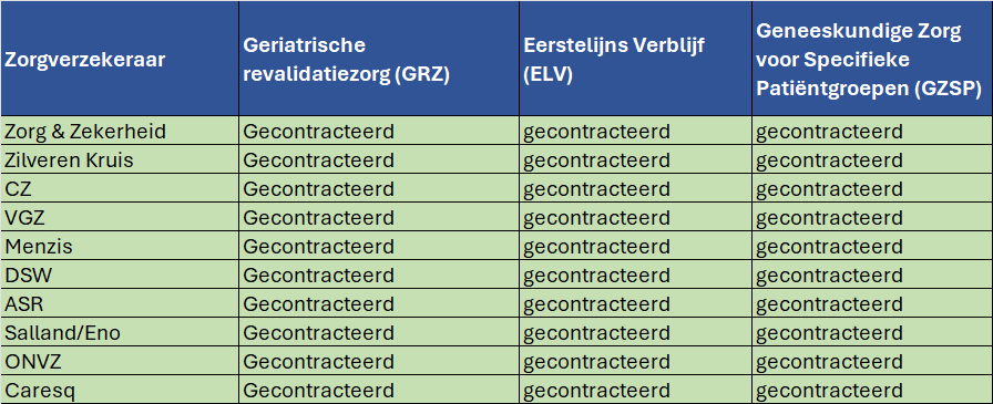Gecontracteerd betekent dat wij een afspraak hebben met deze zorgverzekeraar. U hoeft geen eigen bijdrage te betalen voor de zorg die u nodig hebt en waarover u met ons afspraken heeft gemaakt. Mogelijk betaalt u wel het eigen risico aan uw zorgverzekeraar.