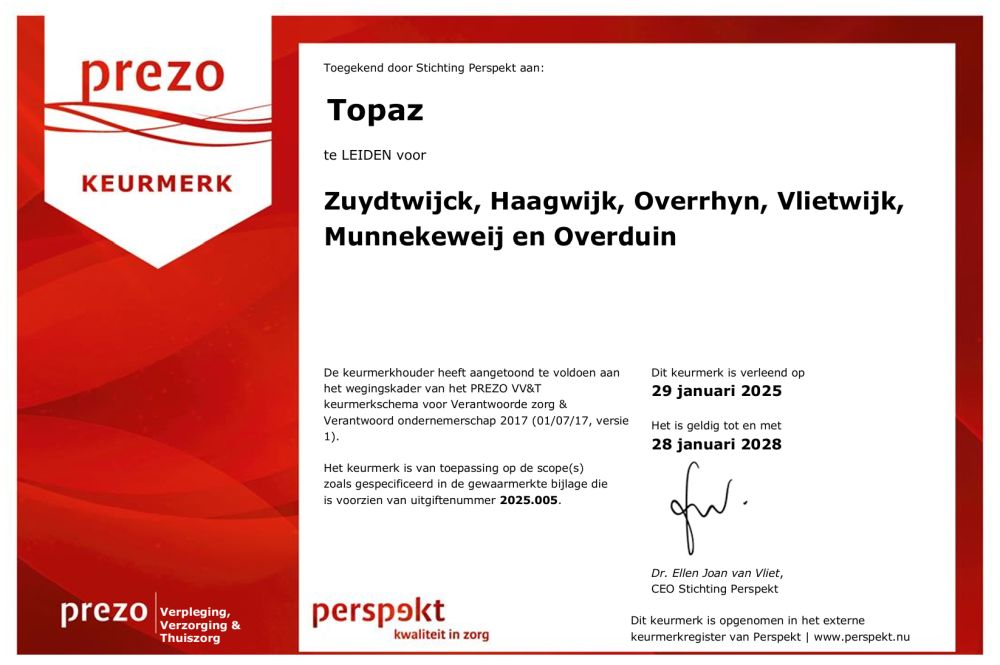 De vijf ontmoetingscentra van Topaz hebben het Prezo keurmerk.